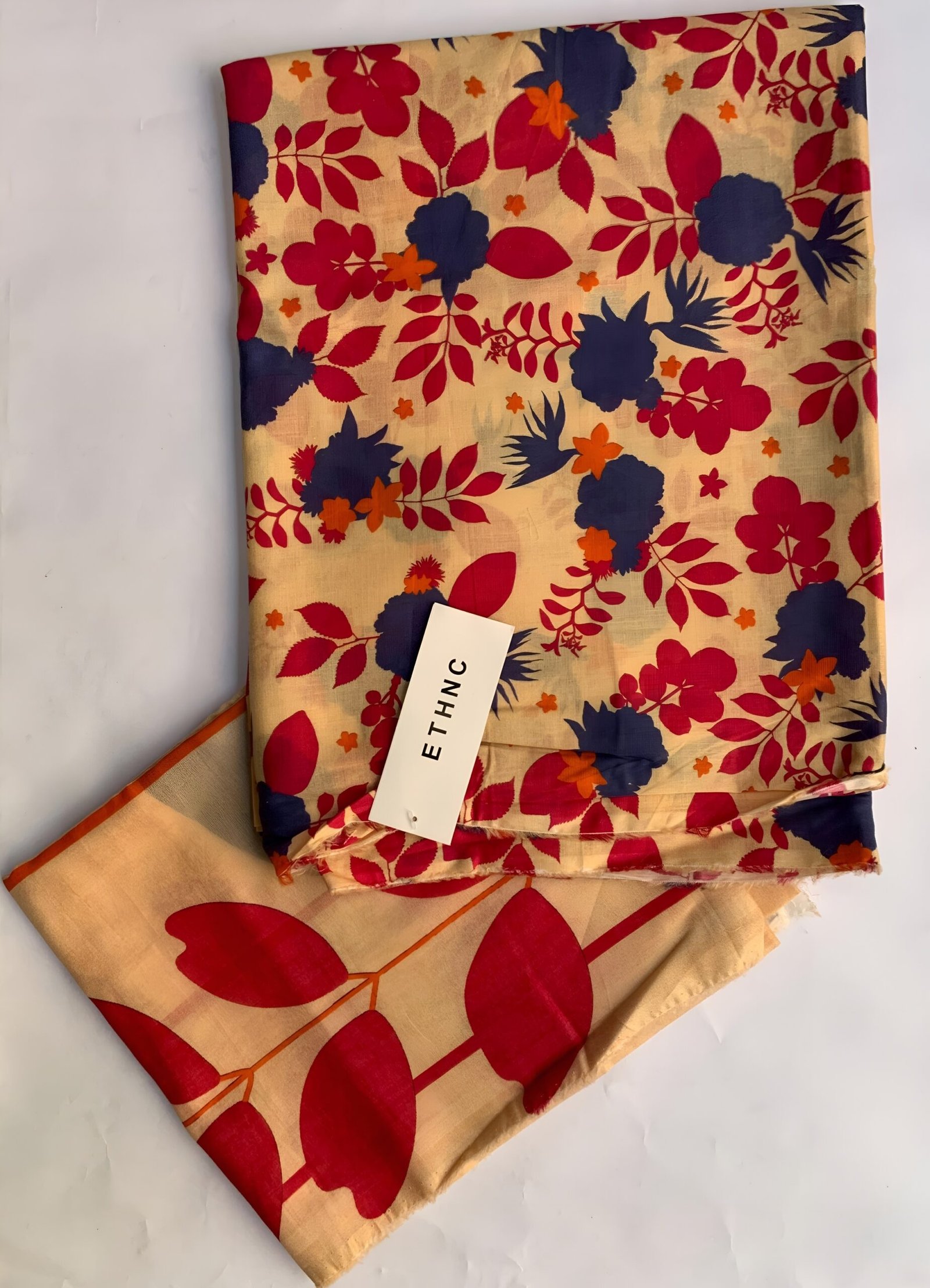 Embrace an earthy elegance with this beautiful 3-piece unstitched printed lawn suit from ETHNC. Featuring a captivating mix of rustic red leaves and deep blue floral accents on a warm, light-toned background, this suit offers a unique blend of traditional style and natural charm.