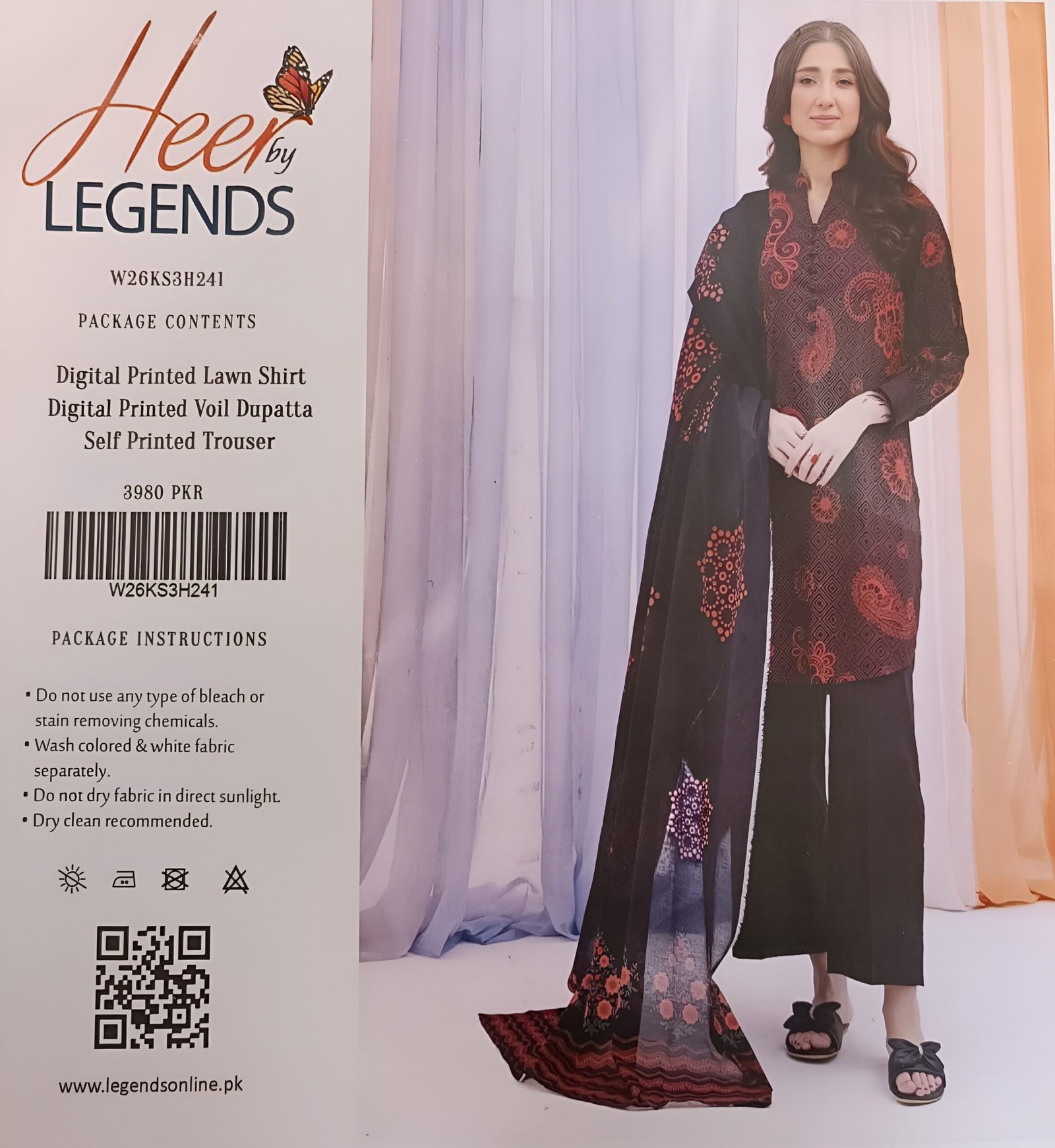 Embrace a timeless look with this sophisticated 3-piece unstitched suit from Heer by Legends. The black lawn shirt showcases elegant maroon paisley designs, paired with a matching voile dupatta featuring striking motifs. The self-printed trouser ensures a polished and coordinated finish.