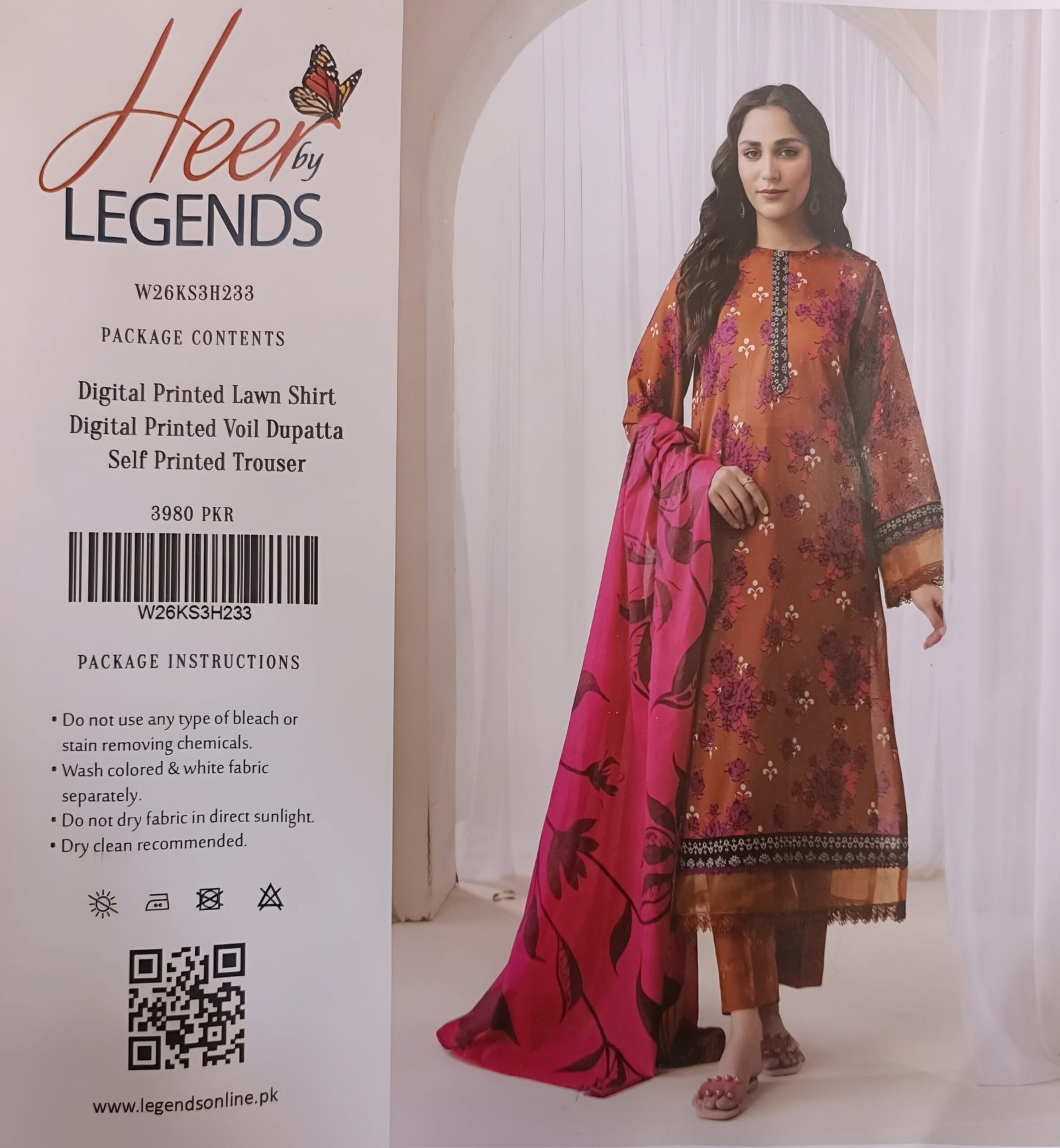 Embrace lively florals and warm tones with this chic 3-piece suit by Heer by Legends. The rust-colored digital printed lawn shirt features delicate floral motifs, while the vibrant pink voile dupatta adds a pop of color. Comes with a self-printed trouser for a balanced and stylish ensemble.