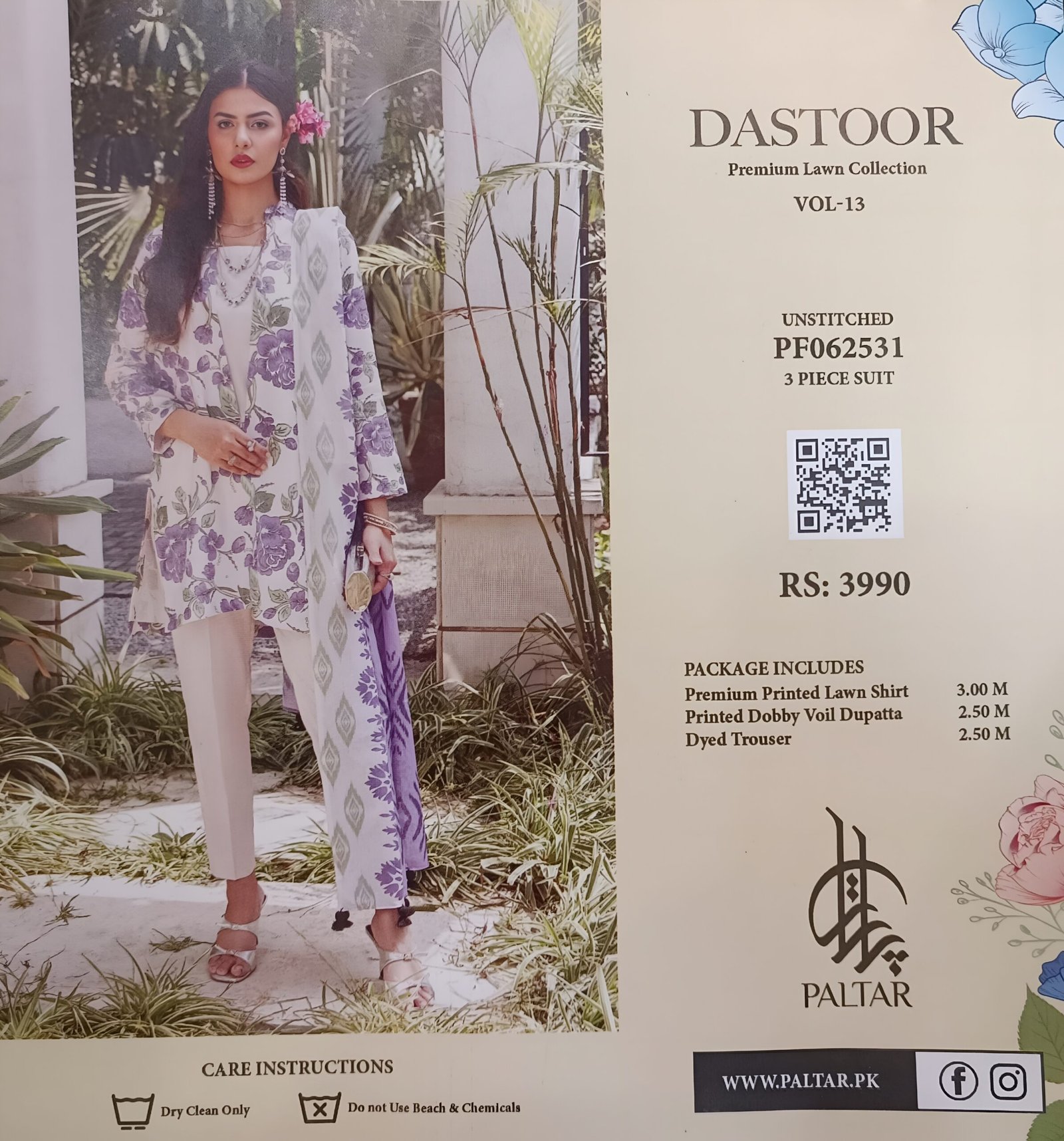 A soft symphony of lilac and ivory, this elegant Dastoor ensemble is a breath of fresh air. The delicate floral print on the premium lawn shirt is beautifully paired with a flowy dobby voile dupatta and plain dyed trousers — perfect for a timeless summer statement.