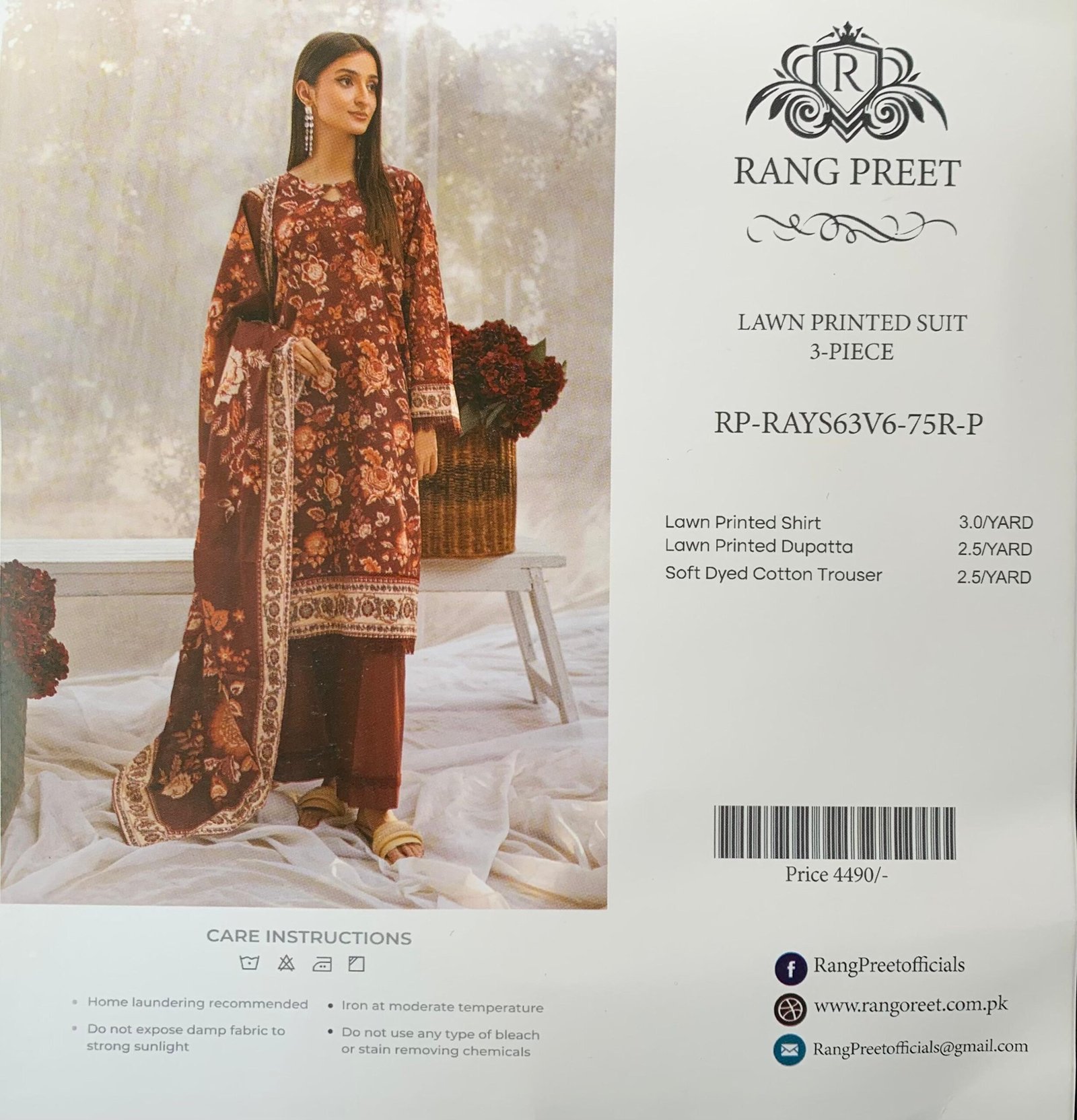 Elevate your everyday style with this elegant maroon 3-piece lawn suit by Rang Preet. Showcasing intricate floral and paisley prints in warm, earthy tones, this outfit includes a printed shirt, a matching dupatta, and soft dyed cotton trousers. A perfect pick for seasonal wear, family gatherings, and casual outings.