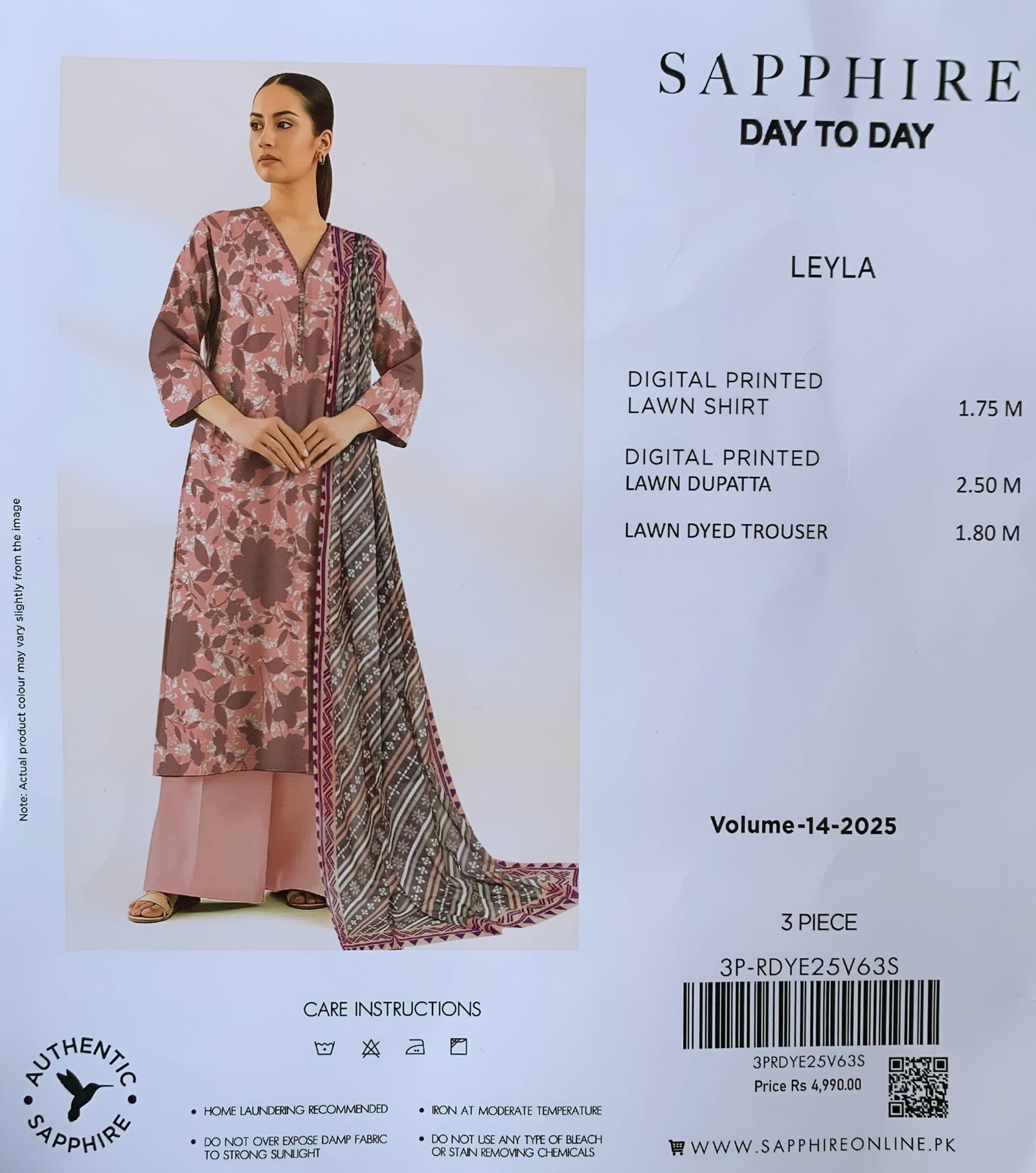 Embrace effortless sophistication with this soft brown 3-piece Leyla suit from Sapphire’s Day to Day collection. Featuring a digitally printed floral lawn shirt and a geometric patterned dupatta, this set is paired with a pastel-toned lawn dyed trouser – ideal for understated everyday elegance.